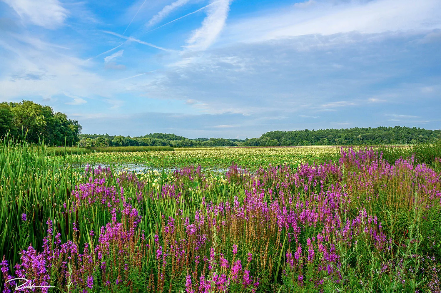 When we first visited in early August, the yellow lotuses were just blooming and they consumed almost the entire wetlands contained within this 12 mile conservation area. Their contrast with the plentiful purple loosestrife and the bright sunlight of the day were just right for a Monet painting.